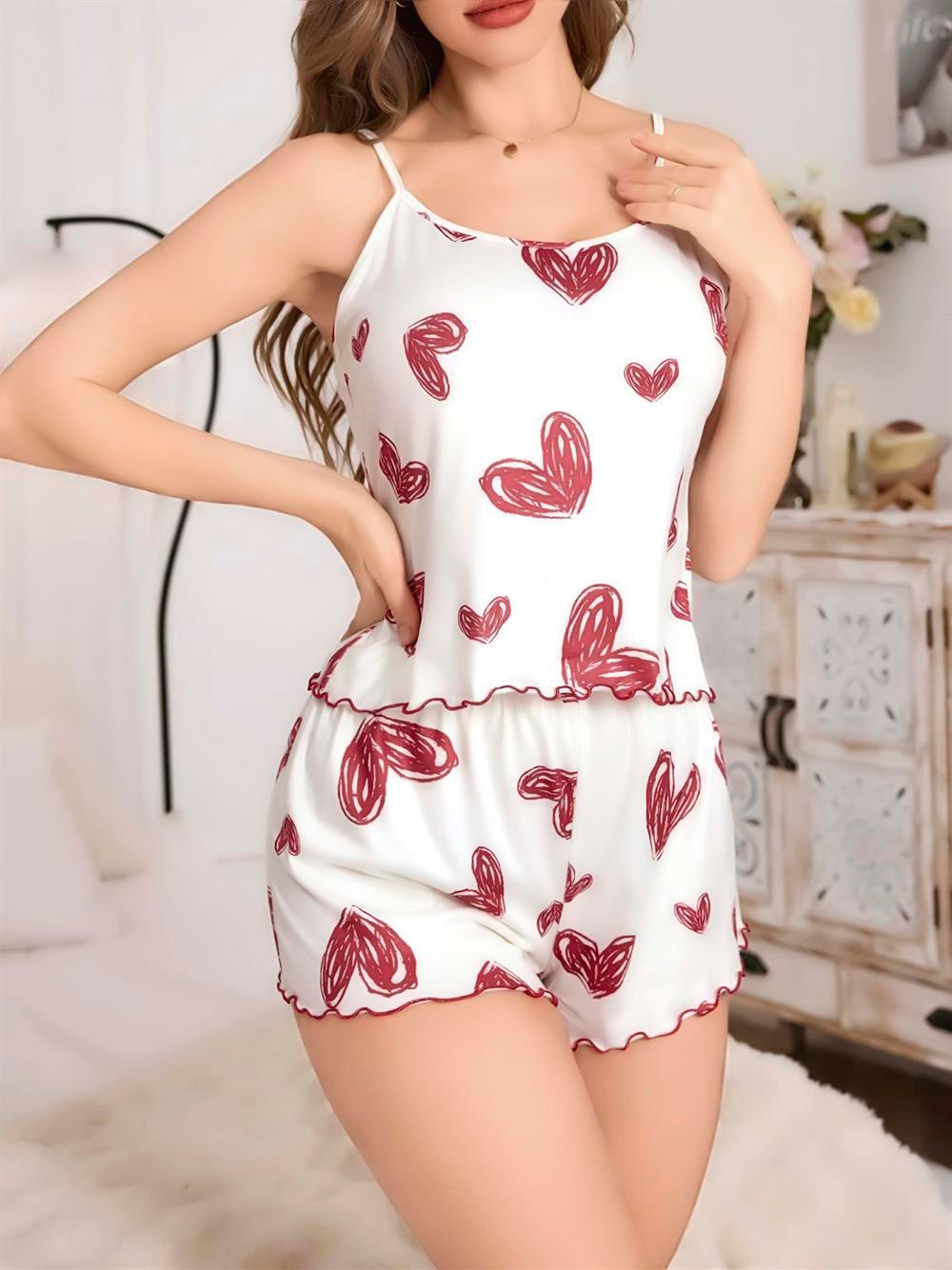 Kadın beyaz Kalp baskılı şortlu gecelik pijama takımı, cesur ve şık bir görünüm yaratır. Yumuşak kumaşı sayesinde rahat kullanım imkanı sunar.